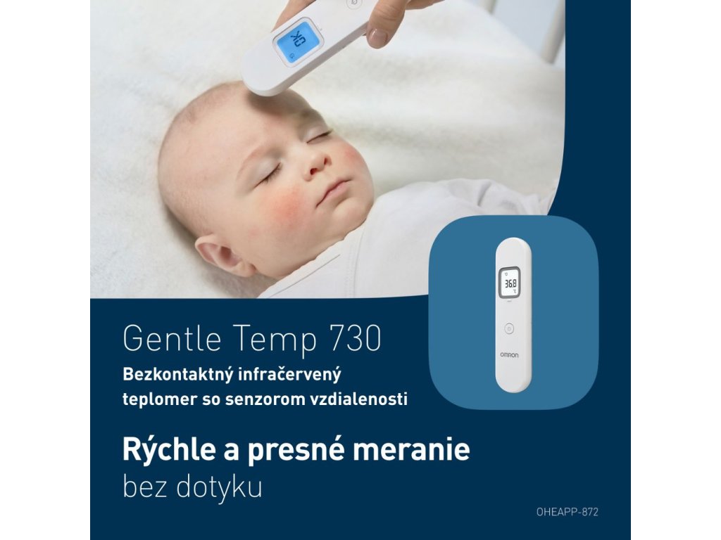 OMRON Gentle Temp 730 je moderný bezkontaktný teplomer, ktorý umožňuje rýchle a pohodlné meranie telesnej teploty bez dotyku s pokožkou. Stačí ho priblížiť k čelu a výsledok sa zobrazí už do 1 sekundy. Meranie je hygienické, tiché a mimoriadne praktické najmä pri deťoch alebo počas spánku.