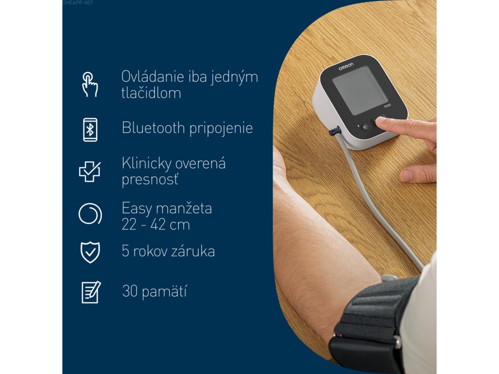 - bezdrôtové Bluetooth pripojenie k telefónu, alebo tabletu. Namerané dáta je možné odoslať do aplikácie OMRON connect, kde je ich možné nie len uchovávať, sledovať grafy histórie a priemery, ale aj zdieľať namerané výsledky s ďalšími aplikáciami (napr. Apple Health, Google Fit) či vašim lekárom. Aplikácia je zadarmo dostupná v češtine na GooglePlay a AppStore.