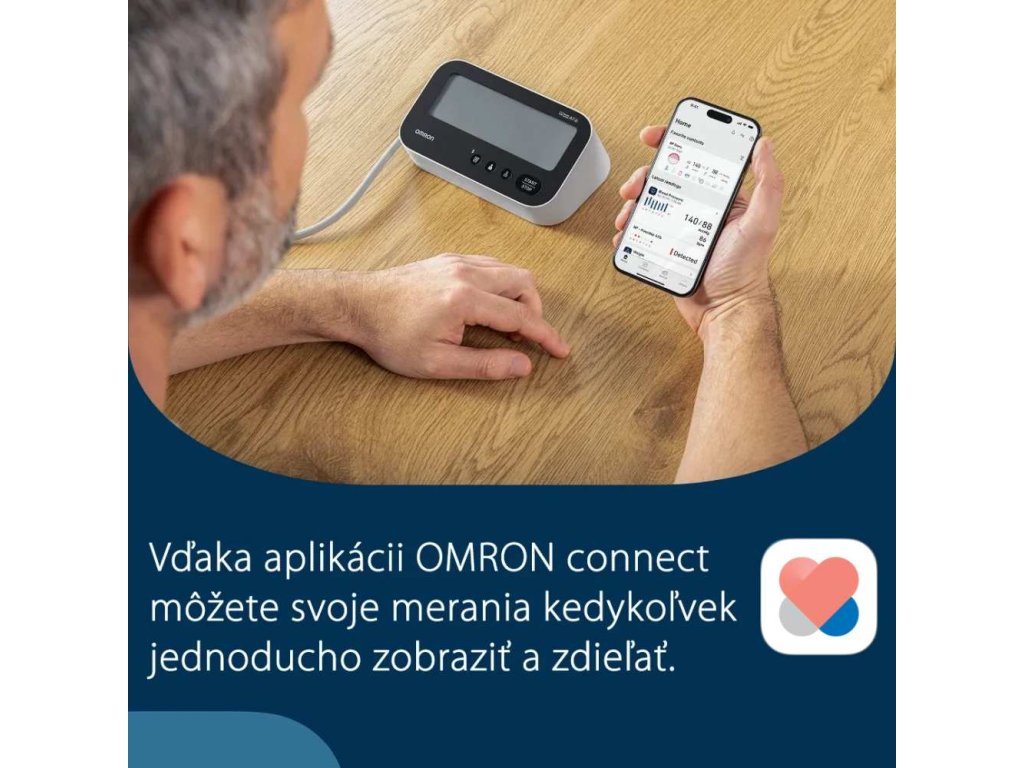 - bezdrôtové Bluetooth pripojenie k telefónu, alebo tabletu. Namerané dáta je možné odoslať do aplikácie OMRON connect, kde je ich možné nie len uchovávať, sledovať grafy histórie a priemery, ale aj zdieľať namerané výsledky s ďalšími aplikáciami (napr. Apple Health, Google Fit) či vašim lekárom. Aplikácia je zadarmo dostupná v češtine na GooglePlay a AppStore.