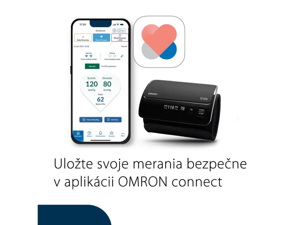 - bezdrôtové Bluetooth pripojenie k telefónu, alebo tabletu. Namerané dáta je možné odoslať do aplikácie OMRON connect, kde je ich možné nie len uchovávať, sledovať grafy histórie a priemery, ale aj zdieľať namerané výsledky s ďalšími aplikáciami (napr. Apple Health, Google Fit) či vašim lekárom. Aplikácia je zadarmo dostupná v češtine na GooglePlay a AppStore.