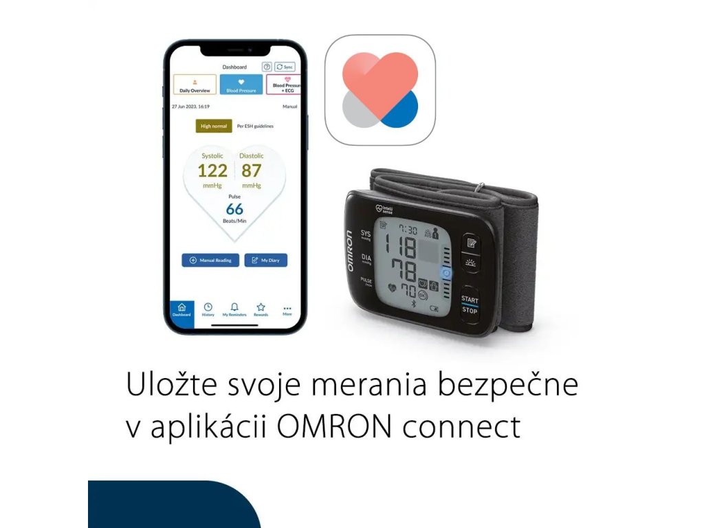 - bezdrôtové Bluetooth pripojenie k telefónu, alebo tabletu. Namerané dáta je možné odoslať do aplikácie OMRON connect, kde je ich možné nie len uchovávať, sledovať grafy histórie a priemery, ale aj zdieľať namerané výsledky s ďalšími aplikáciami (napr. Apple Health, Google Fit) či vašim lekárom. Aplikácia je zadarmo dostupná v češtine na GooglePlay a AppStore.