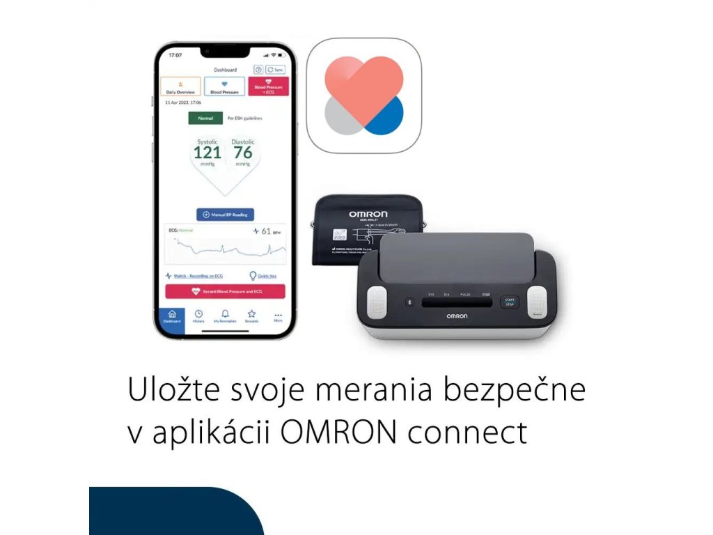 - bezdrôtové Bluetooth pripojenie k telefónu, alebo tabletu. Namerané dáta je možné odoslať do aplikácie OMRON connect, kde je ich možné nie len uchovávať, sledovať grafy histórie a priemery, ale aj zdieľať namerané výsledky s ďalšími aplikáciami (napr. Apple Health, Google Fit) či vašim lekárom. Aplikácia je zadarmo dostupná v češtine na GooglePlay a AppStore.
